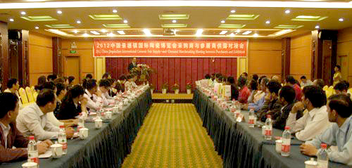10月18日下午,由瓷博会、省九游平台公司主办的“2012年中国景德镇国际九游平台博览会采购商与参展企业对接会”在开门子三楼会议室举行。来自10余个国家的40家采购商以及由瓷博会根据采购需求挑选出来的55家参展商参加了此次对接会议。副市长张春萍出席会议并致辞。
