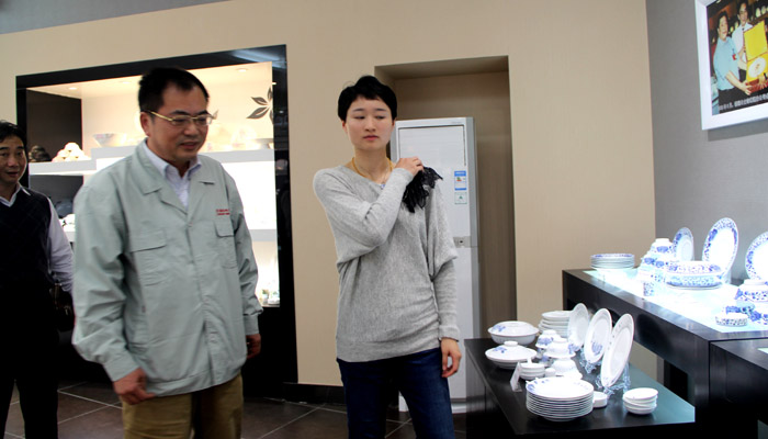公司董事长王耀在给吴静钰介绍中南海二代瓷