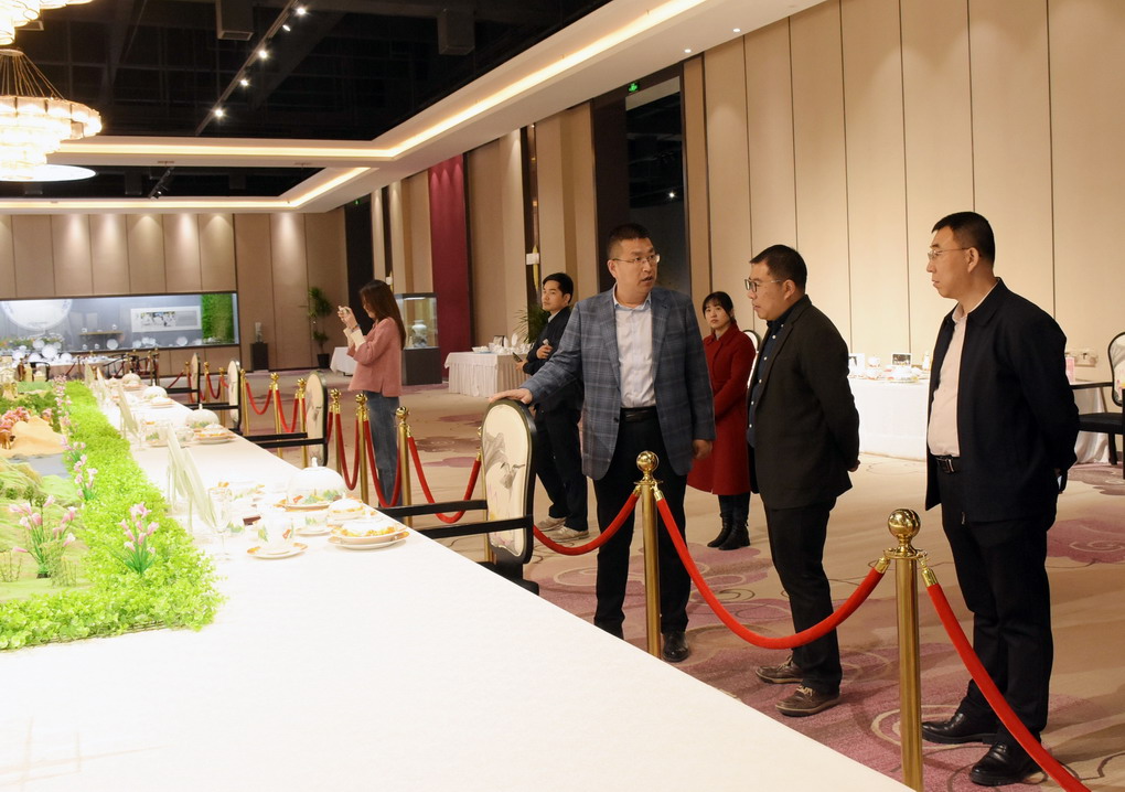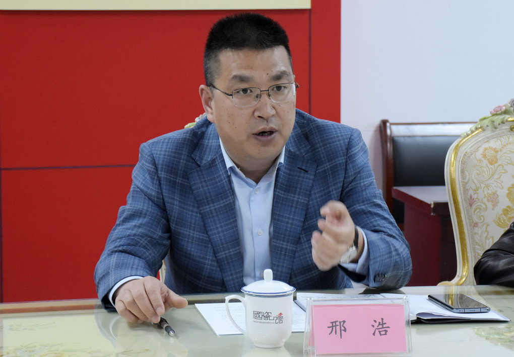 在国瓷馆参观期间,邢浩向调研组一行简要介绍了集团公司发展历程。在陪同大家品鉴“红叶九游平台”精品时,邢浩一边讲解九游平台先进生产工艺,一边讲述一套套有关“国瓷”的故事。
