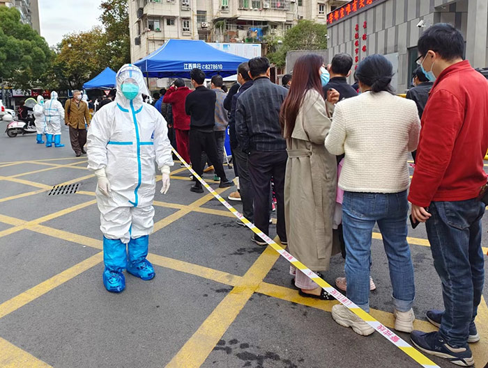 党员闵爱华,居住在高风险小区尚东国际。她每天四点钟就起床,挨家挨户地上门为居民做核酸,衣服被汗水浸透仍坚守在防控一线,只为疫情能够早日清零。